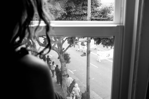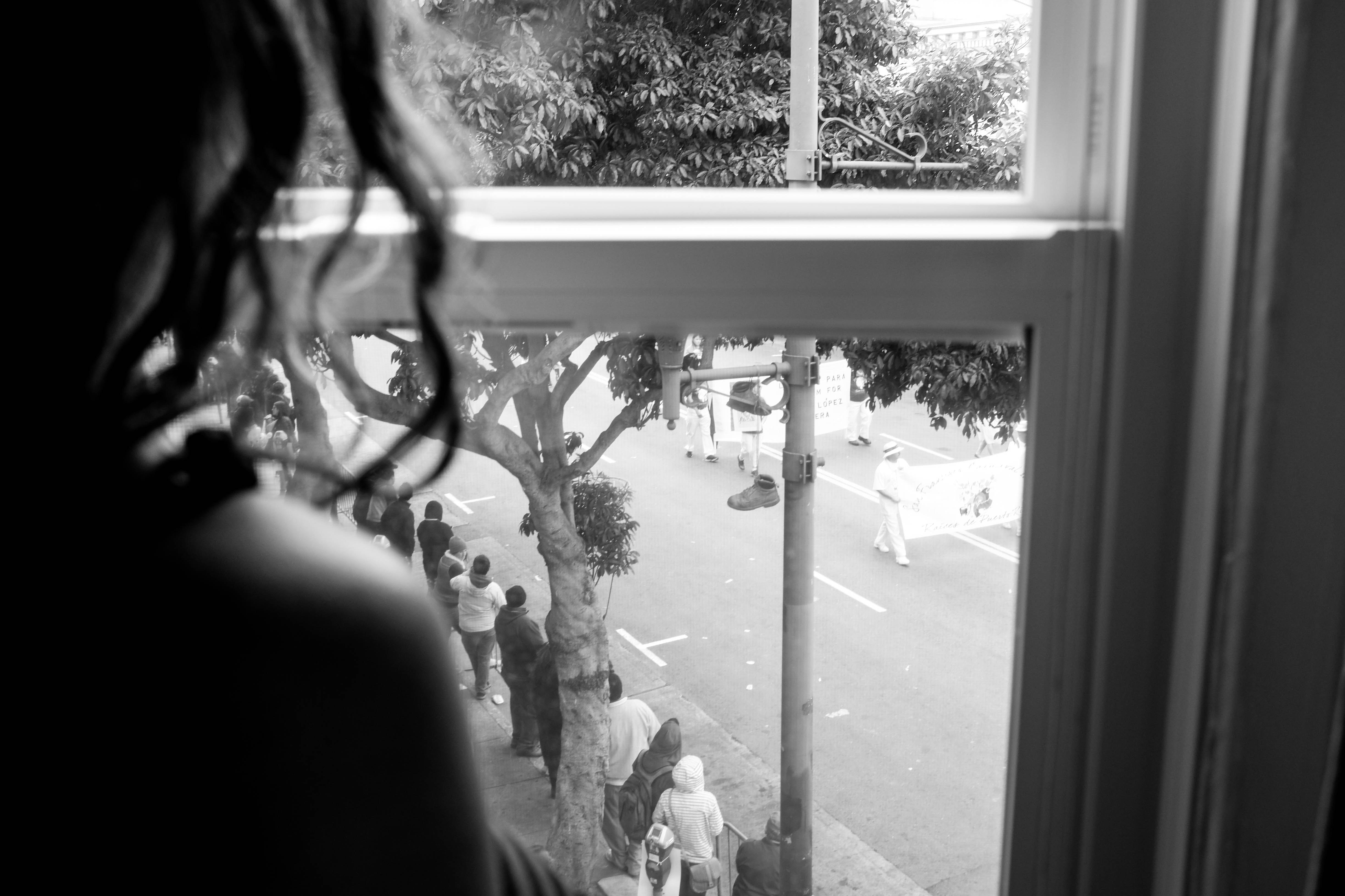 A woman peers out of a window, her silhouette contrasted against the lively scene below. Outside, a gathering of people participates in a street event, united in purpose and energy, all cast in striking monochrome. The framing of the window creates an intimate barrier, evoking a sense of both connection and separation from the vibrant life unfolding outside.