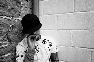 In this moody black-and-white photograph, a lone figure sits against a textured stone wall, his face partially obscured by a tilted cap. The soft lighting highlights the contrast between the stark background and his casual attire, creating an atmosphere of introspection and detachment. The act of smoking adds a layer of contemplation, capturing a moment of quiet solitude amidst the urban landscape.