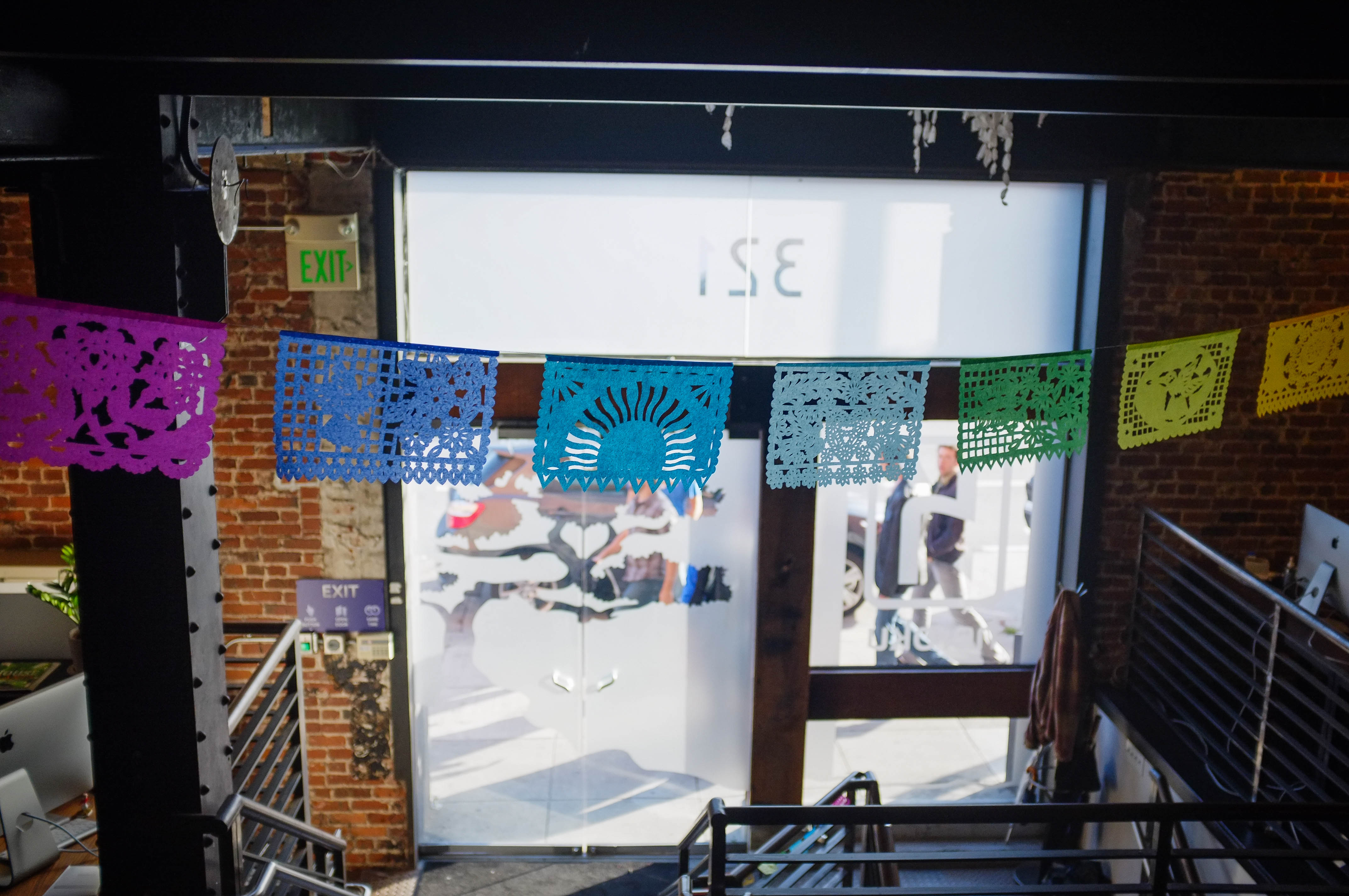 This photograph captures vibrant papel picado banners strung across the interior of a stylish space, evoking a festive mood. Sunlight spills through large windows, highlighting the intricate designs of the banners while casting gentle shadows on the exposed brick wall and modern furnishings. The scene suggests a lively gathering place, blending tradition with contemporary style.