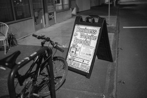 In this stark black-and-white photograph, a bicycle leans against a sidewalk sign advertising a business website special. The nighttime setting is illuminated by soft streetlights, creating a contrast between the darkened surroundings and the bright, attention-grabbing sign. The composition evokes a sense of urban solitude, capturing a moment of quiet urgency amid the stillness of the night.