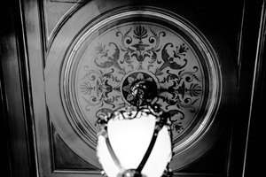 The photograph captures a detailed ceiling design, seen from below, with intricate patterns that evoke a sense of classic elegance. The monochromatic treatment enhances the dramatic interplay of light and shadow, creating a moody atmosphere. A vintage lamp in the foreground draws the eye, framing the ornate artistry above.