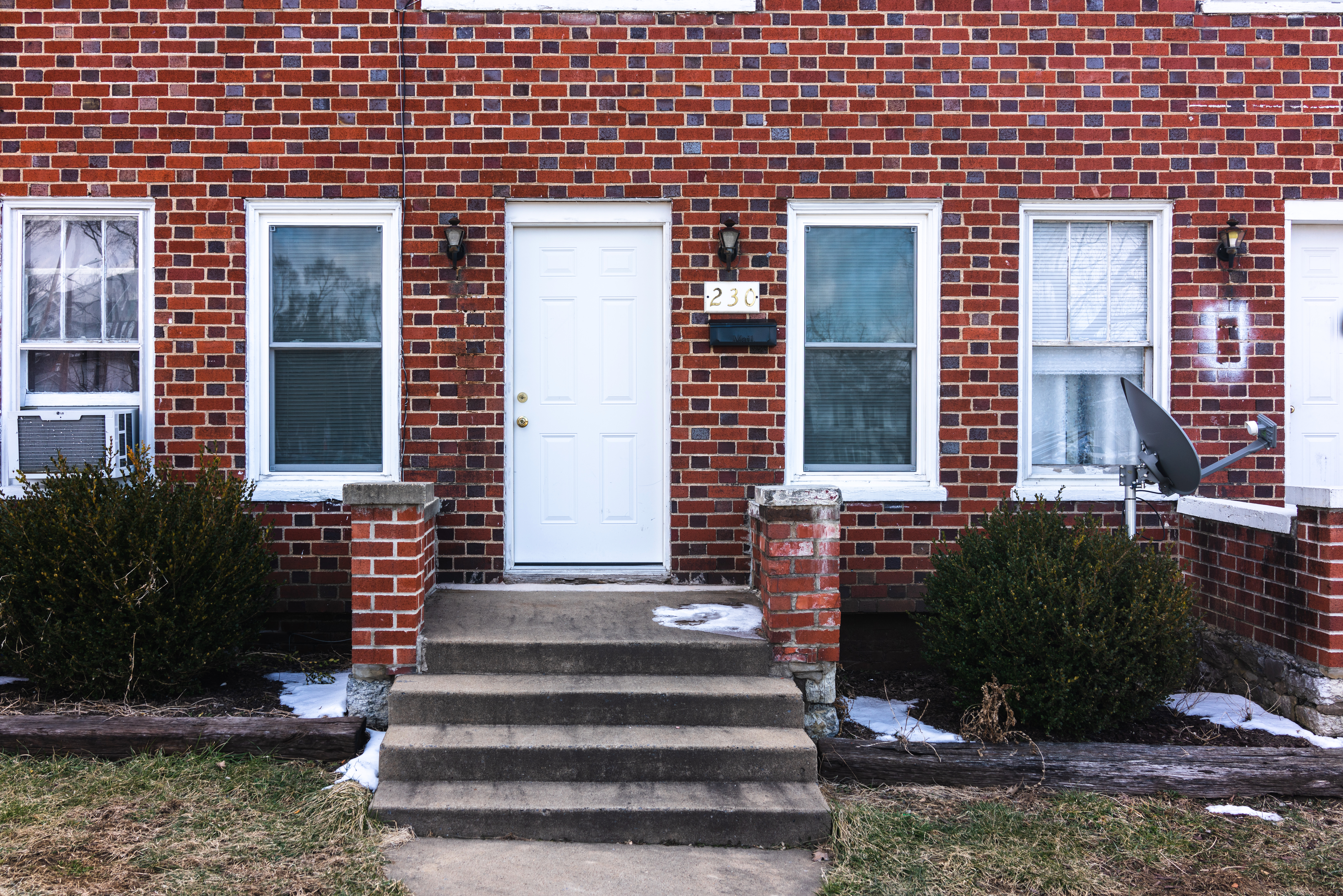 The photograph captures a modest brick exterior, showcasing a white door framed by neat windows, suggesting warmth amidst a chill. Soft winter light highlights the texture of the brick, while patches of snow hint at recent cold weather. The steps leading up to the door invite curiosity, evoking a sense of home and everyday life.