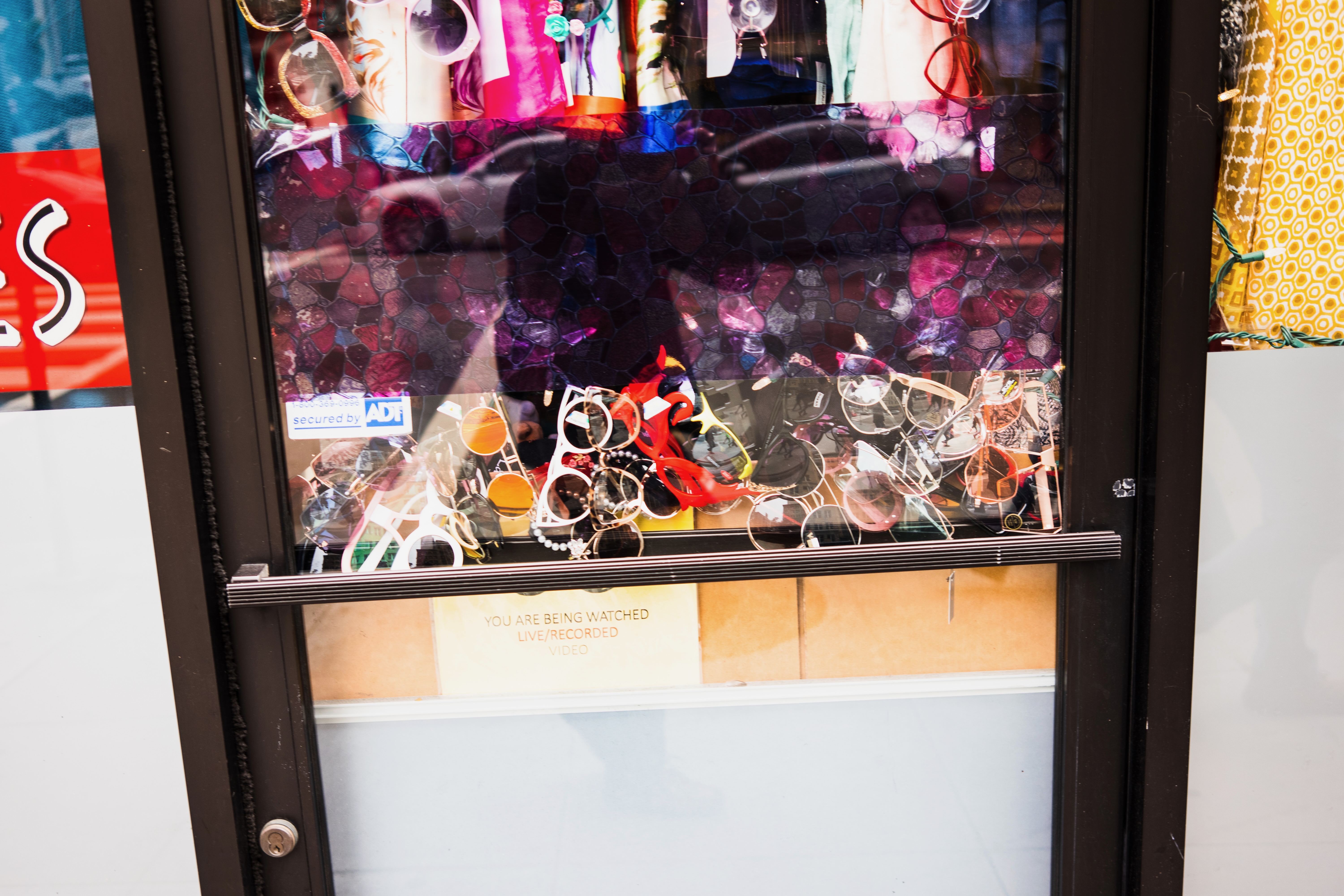 This photograph captures a vibrant window display filled with an array of colorful sunglasses, drawing the viewer's eye into the playful chaos of styles. The bright hues and reflections create a lively and slightly whimsical mood, while the warning sign below introduces an unexpected tension to the scene. The composition expertly balances depth with a layered view of both the displayed accessories and the garments hanging above, inviting contemplation about consumerism in a bustling urban setting.