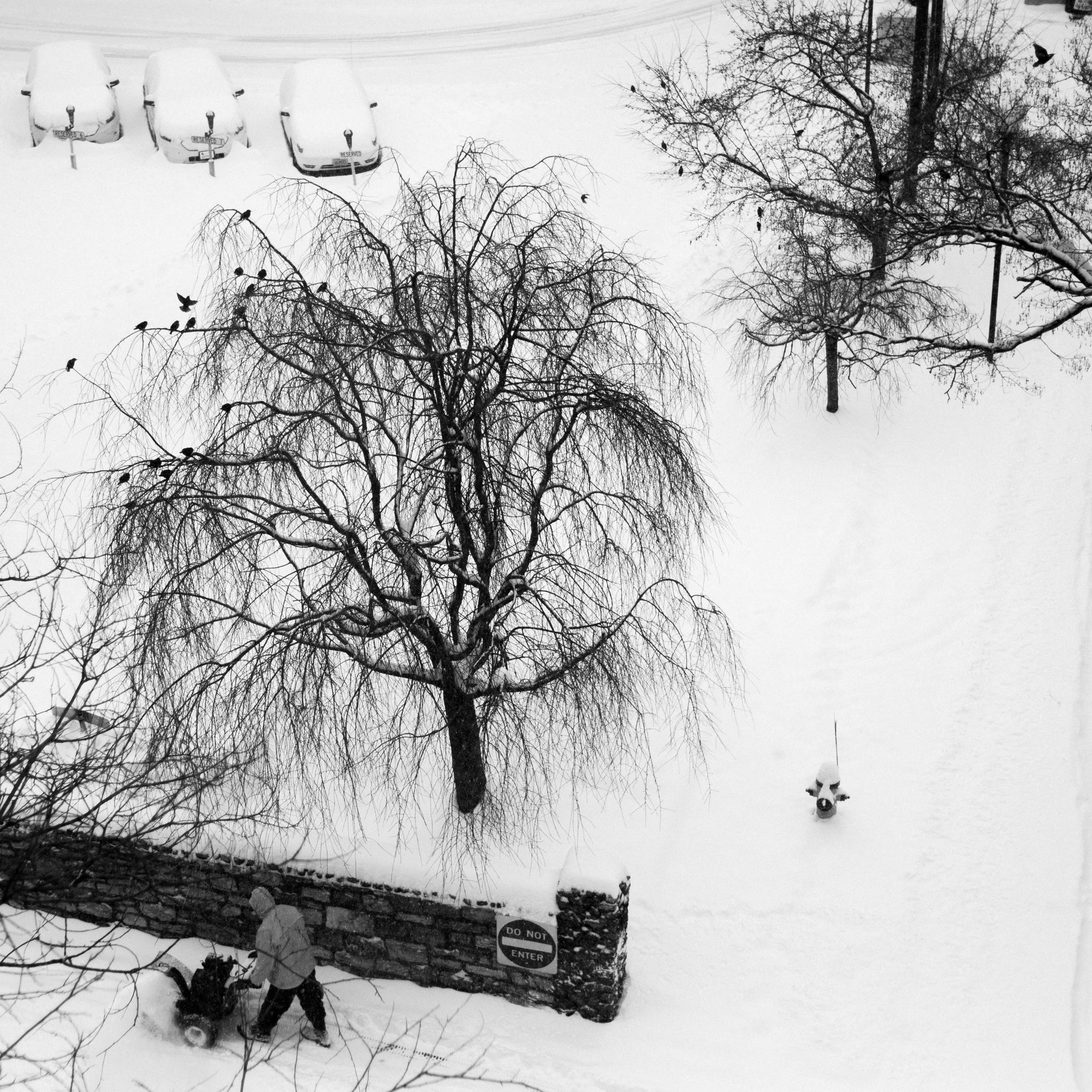 This monochromatic photograph captures a quiet winter day, where a lone figure battles the heavy snowfall outside. The delicate skeletal branches of a nearby tree frame the scene, creating a stark contrast against the thick blanket of white. The mood is serene yet intimate, enhanced by the soft glow from the street lamps illuminating the snow-laden cars.