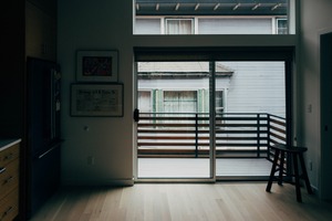This photograph captures a tranquil indoor scene, where a muted palette enhances the feeling of solitude. Soft natural light filters through the sliding glass doors, illuminating the minimalist kitchen and drawing attention to the inviting patio beyond. The contrast between the interior's clean lines and the aged exterior creates a sense of depth and layered history.