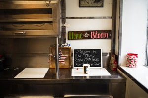 This cozy kitchen corner exudes warmth and welcome, featuring a distinct blend of rustic charm and modernity. A colorful sign details the sentiment of 'Home is where the Bloom is,' while natural light floods the space, casting soft shadows and illuminating personal touches like a chalkboard and playful decor. The composition, with its stainless steel surfaces contrasting the inviting accents, creates an atmosphere of comfort and nostalgia.