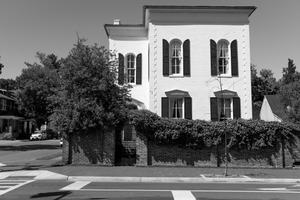 The photograph captures a stately white house, framed by lush green foliage and low brick walls, encapsulating a sense of nostalgic charm. The strong contrasts of black and white enhance the architectural details, while the sunlight casts gentle shadows, creating a serene yet striking mood. The composition invites the viewer to pause and appreciate the quiet beauty of this historic dwelling, nestled in its urban surroundings.