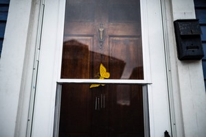 This photograph captures a wooden door framed by crisp white trim, featuring a vibrant yellow butterfly peeking through the glass. The warm tones of the door contrast with the cool, muted colors of the surroundings, creating an inviting yet slightly mysterious atmosphere. Soft lighting highlights the intricate details of the butterfly, enhancing the sense of whimsy and charm in this intimate entryway.