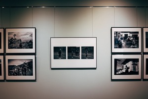 The image captures a series of black-and-white photographs displayed in a modern gallery setting, inviting viewers to explore the contrast between light and shadow. The mood is contemplative, with varying scenes of everyday life and nature, punctuated by moments of stillness and action. The soft, diffused lighting enhances the intricate details of the framed images, creating a serene ambiance that encourages reflection.