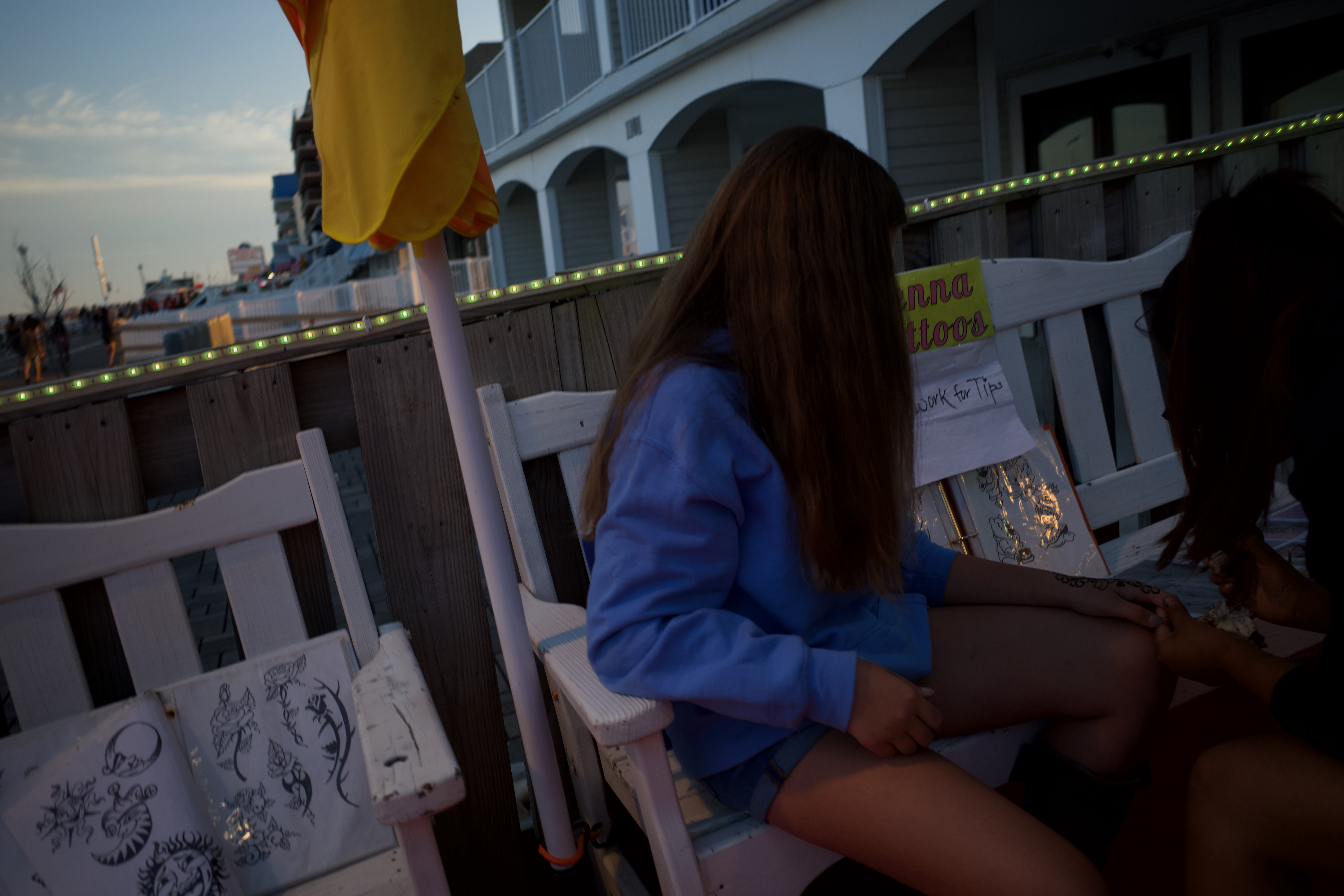 In this intimate beachside scene, a girl sits quietly, her attention focused on the intricate tattoo design being applied to her leg by a friend. The soft, golden light of dusk enhances the relaxed mood, while the vibrant colors of the surroundings hint at a lively beachfront atmosphere. With a casual elegance and a sense of summer freedom, this photograph captures a moment of youthful creativity and friendship under the fading sun.