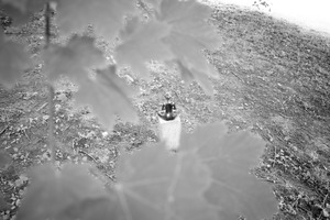 A striking black and white photograph that captures a subtle scene where the primary subject—a stone object—emerges from a blurred foreground of leaves. The soft focus creates a sense of mystery and introspection, drawing the viewer’s attention to the quiet details of the setting. The interplay of light and shadow enhances the mood, evoking a contemplative atmosphere amid the natural surroundings.