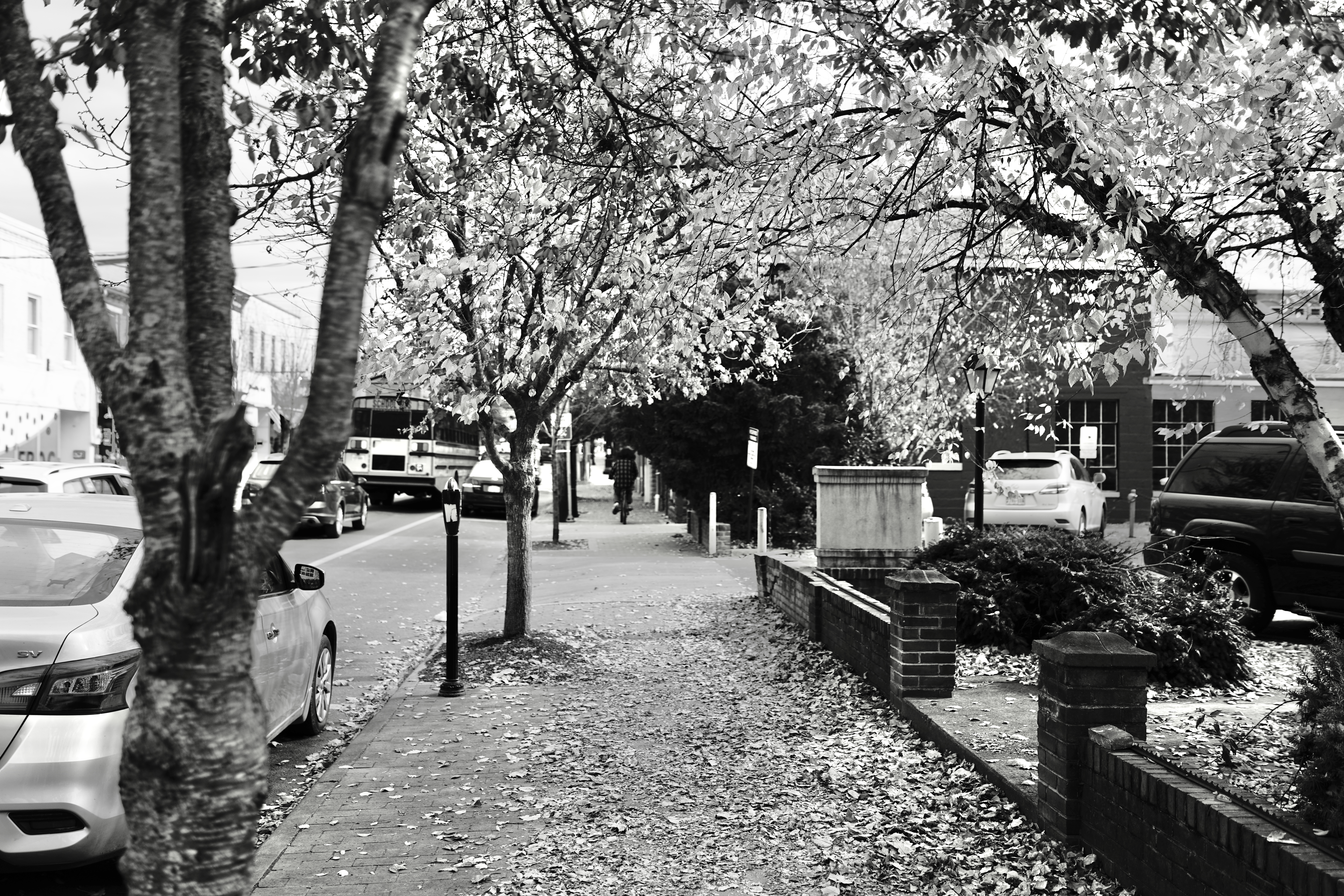 The photograph captures a tranquil sidewalk flanked by trees shedding their autumn leaves, evoking a serene yet wistful mood. The soft black and white tones enhance the peaceful atmosphere, drawing attention to the subtle play of light and shadow along the path. Cars line the street, and a solitary figure walks by, adding a sense of quiet life to the scene.