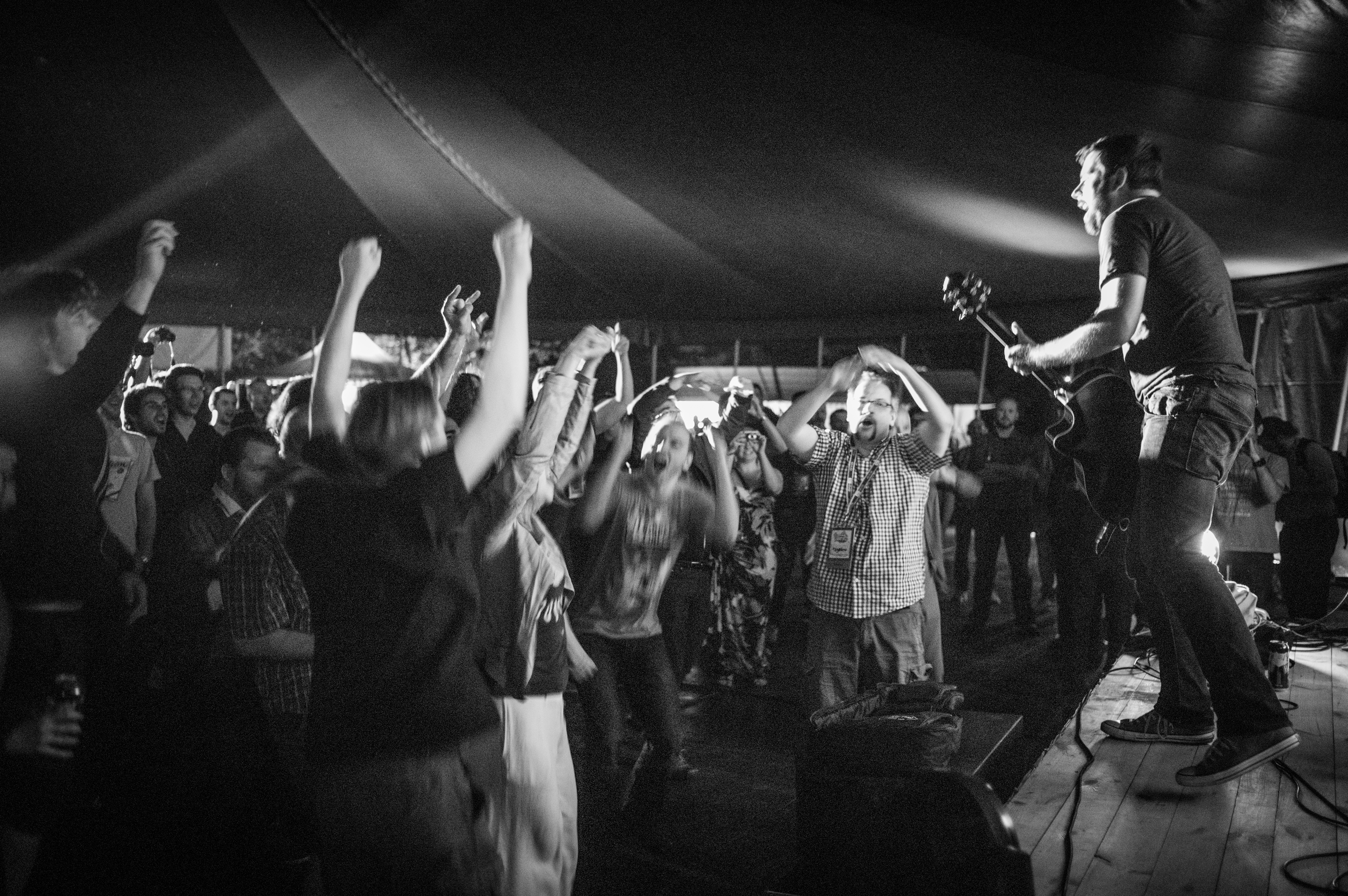 The photograph captures an energetic live performance, with a guitarist passionately playing under the soft glow of stage lights. The crowd, enveloped in shadows, is animatedly dancing, their raised arms reflecting a shared sense of joy and exhilaration. The monochrome tones enhance the dynamic atmosphere, emphasizing the connection between the performer and the audience.