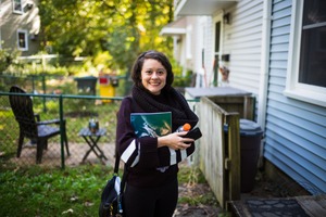 A young woman stands cheerfully in front of a cozy home, holding a book and a snack, exuding warmth and friendliness. The soft, natural light filters through the trees, illuminating her smile and creating a welcoming atmosphere. The rich greens and browns of the garden backdrop enhance the sense of comfort and connection to nature.