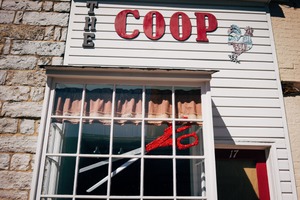 The photograph captures the inviting storefront of a place called 'The Coop', adorned with bold red lettering and an eye-catching pair of oversized scissors in the window. Soft, natural light filters through the glass, enhancing the warm, nostalgic atmosphere while the quaint details of the building's architecture evoke a sense of community charm. The juxtaposition of modern signage against the classic stone wall adds a unique character to the scene.