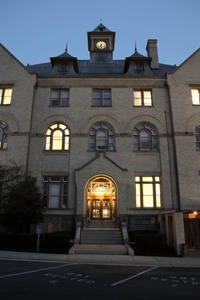 The imposing brick facade of the historic building stands tall as evening descends, with warm golden lights illuminating the entrance and windows. A clock perched at the top adds a touch of nostalgia, contrasting against the deepening blue sky. The composition draws the viewer's gaze upward, evoking a sense of quiet reverence and inviting exploration.
