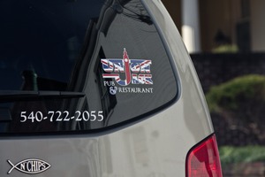 This photograph highlights a vehicle's rear window adorned with a colorful sticker promoting a pub and restaurant. The bold, graphic design featuring the Union Jack evokes a sense of camaraderie and vibrant social life. Soft natural light enhances the clarity of the sticker, adding an inviting touch to the overall composition.