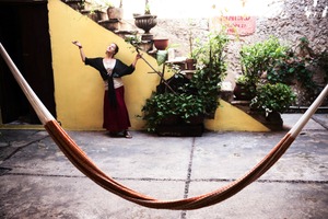 Against a backdrop of vibrant yellow walls and lush greenery, a woman joyfully extends her arms, embodying the essence of freedom and relaxation. The hammock in the foreground anchors the composition, drawing the eye toward the serene atmosphere of this intimate courtyard setting. Soft, natural light bathes the scene, enhancing the calming mood and highlighting the rich textures of the surroundings.