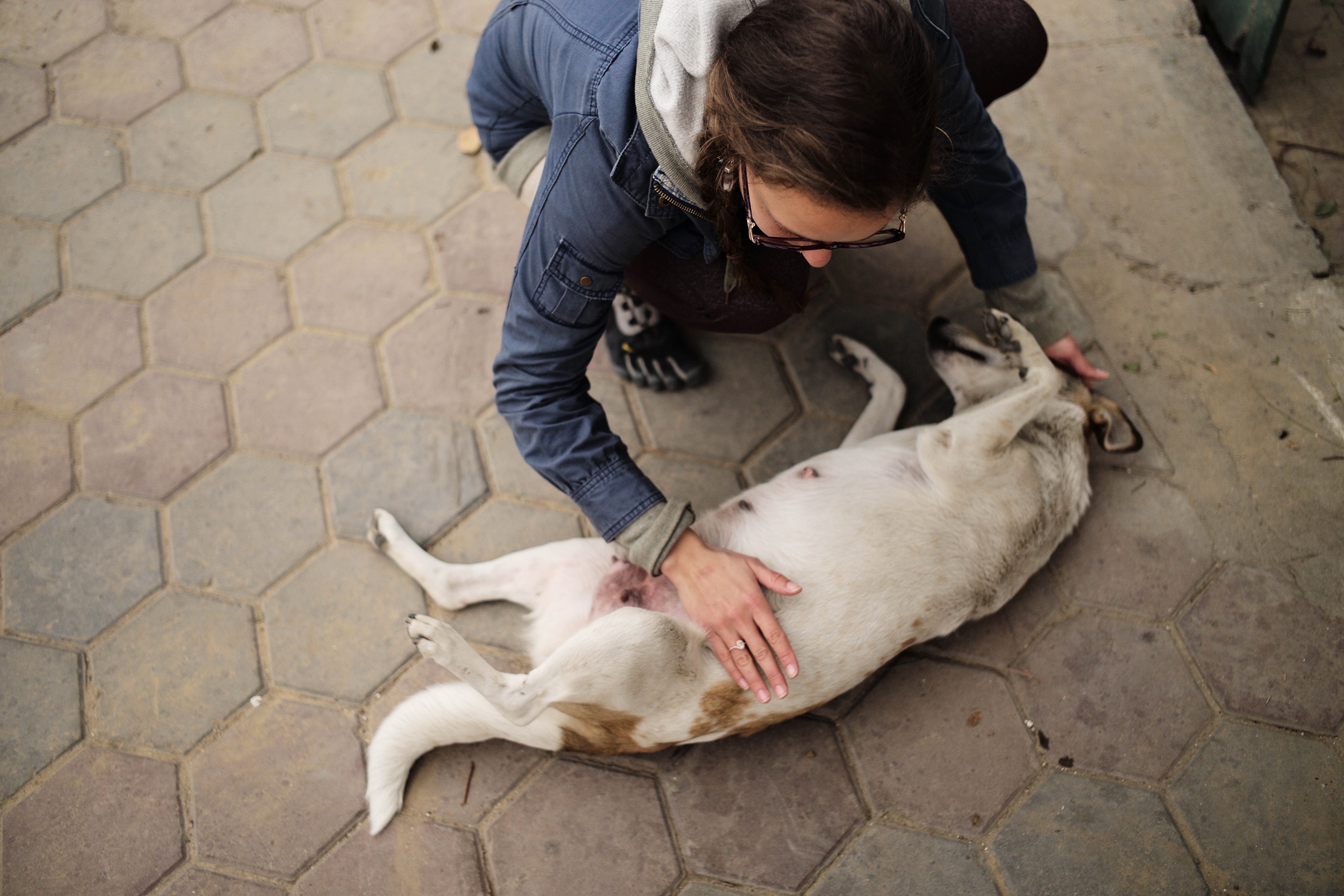 In this heartwarming photograph, a woman kneels on textured stone pavement, gently petting a contented dog lying on its back, revealing its trusting nature. The soft, natural light highlights the tender interaction, creating an intimate mood filled with warmth and affection. The composition draws the viewer in, emphasizing the bond between human and animal in a candid, serene moment.