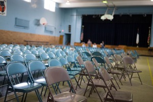 This photograph captures an expansive view of a row of empty chairs in a spacious community hall, evoking a sense of anticipation and solitude. The soft lighting highlights the blue tones of the chairs and the warm hues of the walls, creating a calm yet slightly melancholic atmosphere. In the distance, a small gathering of people hints at life beyond the emptiness, drawing the viewer's eye towards the stage area.