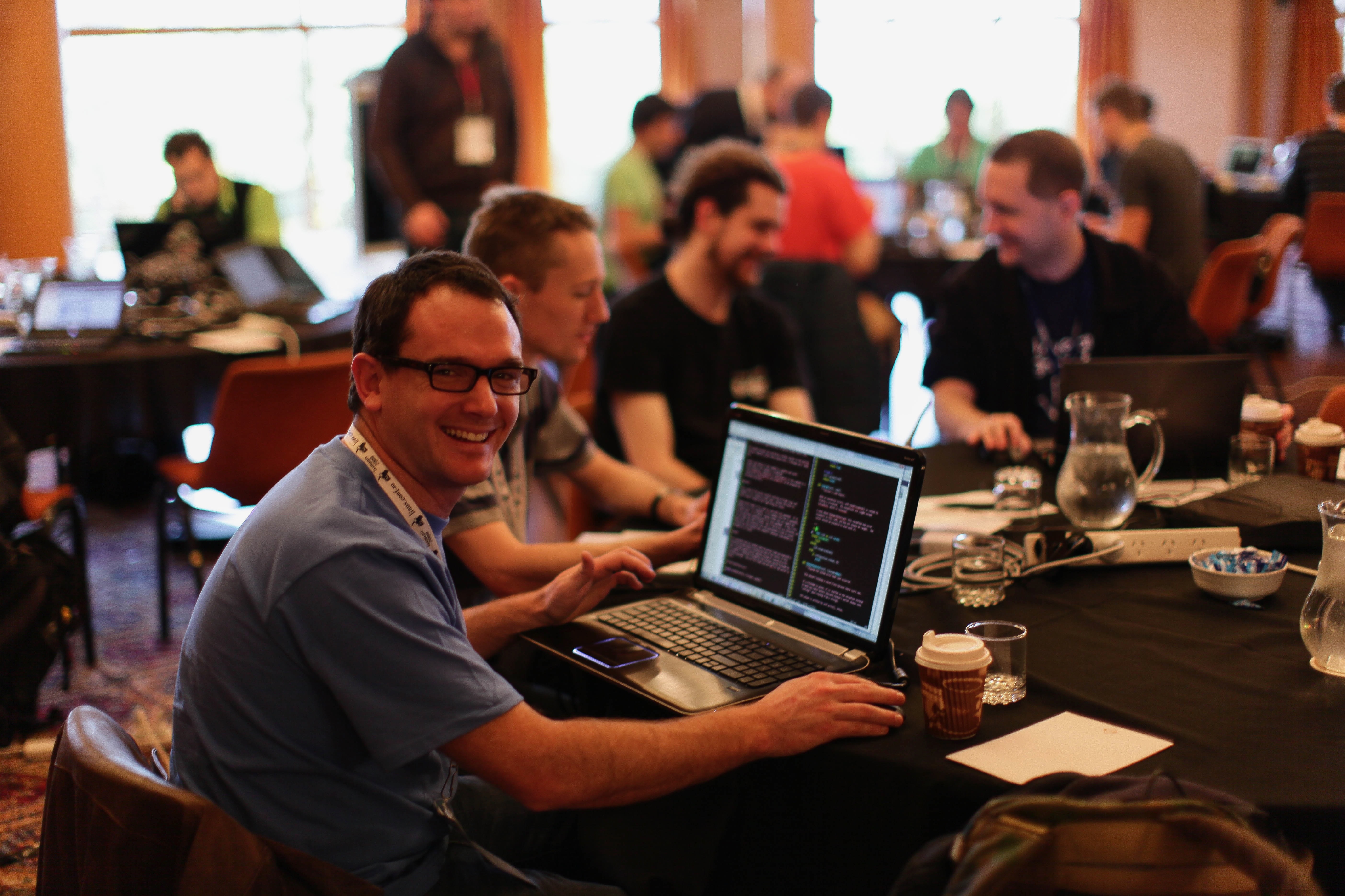 The photograph captures a lively scene of individuals engaged in collaborative work at a conference. Warm lighting bathes the room, enhancing the friendly atmosphere, while the central figure beams with enthusiasm, embodying the spirit of innovation and teamwork. Laptops and coffee cups scattered across the tables highlight a focused yet relaxed environment, rich with the buzz of creativity and shared ideas.