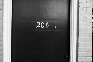The photograph captures a close-up of a black door marked with the number '20½', evoking a sense of intrigue and curiosity. The stark contrast between the dark door and the bright white markings, coupled with the muted tones of the brick wall nearby, creates a somber yet inviting atmosphere. Soft lighting subtly highlights the door's texture, drawing the viewer's gaze to its understated details.