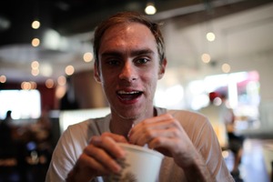 The photograph captures a young man enjoying a light moment, his cheerful expression radiating warmth and openness. Soft, diffused lighting highlights his features against a softly blurred background filled with ambient restaurant details, creating an inviting and relaxed mood. The intimate composition draws the viewer into his experience, emphasizing a shared enjoyment of food and company.