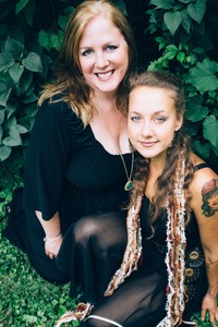 This photograph captures two women seated against a lush backdrop of green foliage, exuding warmth and connection. Their serene expressions and the soft, diffused lighting create an intimate and inviting atmosphere, emphasizing their close relationship. The contrast between the vibrant greenery and their darker outfits enhances the natural harmony of the scene.