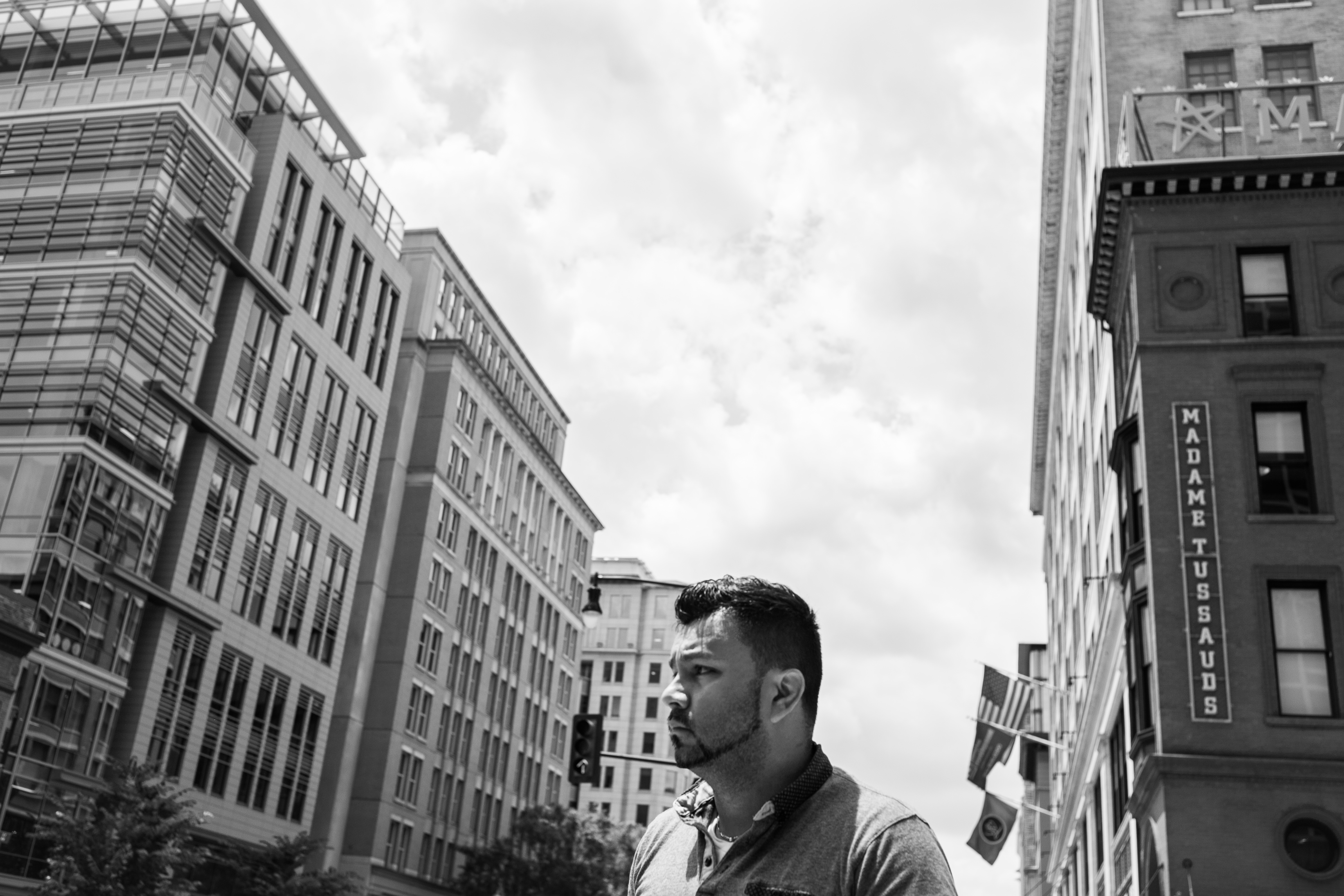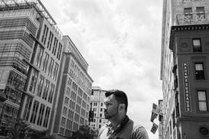 In a dynamic urban landscape, a man stands contemplatively amid towering buildings. The stark black-and-white composition emphasizes the contrast between his expression and the bustling city around him, while soft clouds drift overhead, lending a contemplative mood to the scene.