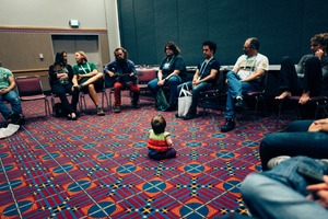 In a cozy gathering, a baby sits on a vibrant patterned carpet, the centerpiece of attention. Surrounding adults exhibit a mix of curiosity and amusement, creating a warm, inviting atmosphere. The soft lighting enhances the intimate mood, highlighting the contrast between the child's innocence and the focused conversations of the adults.