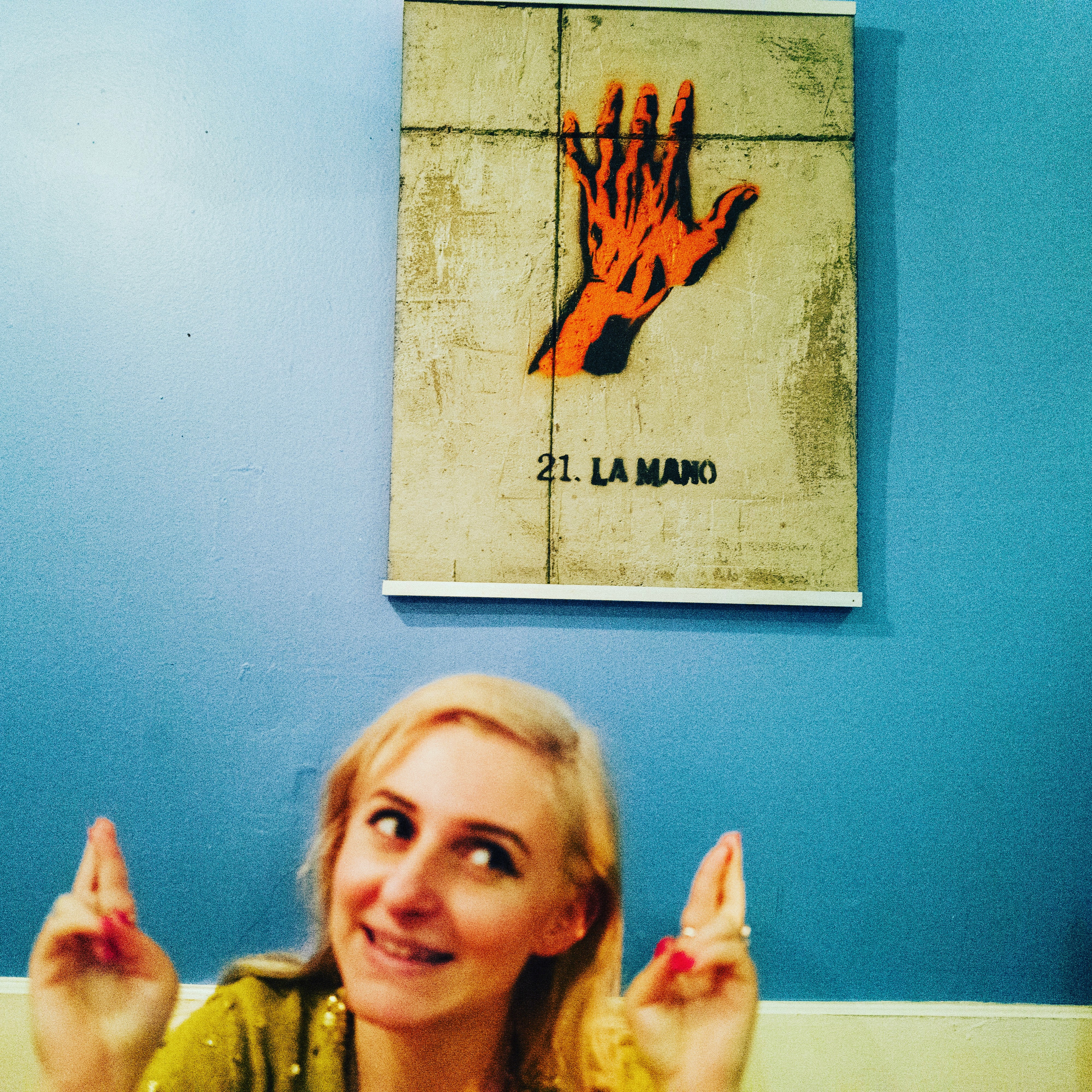 In a vibrant blue setting, a young woman playfully gestures with her fingers crossed, suggesting hope or wishfulness. Behind her, an intriguing piece of artwork featuring an orange hand contrasts against the muted wall, creating a compelling visual dialogue. The warm lighting adds a lively yet intimate atmosphere, enhancing the cheerful mood of the scene.