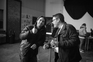 Two men share a jovial moment, exuding camaraderie and enthusiasm as they engage in lively conversation. The black and white composition accentuates the warmth of the scene, highlighting their expressive gestures against a softly lit backdrop. The relaxed atmosphere invites viewers to share in their joy, encapsulating a transient moment of connection.