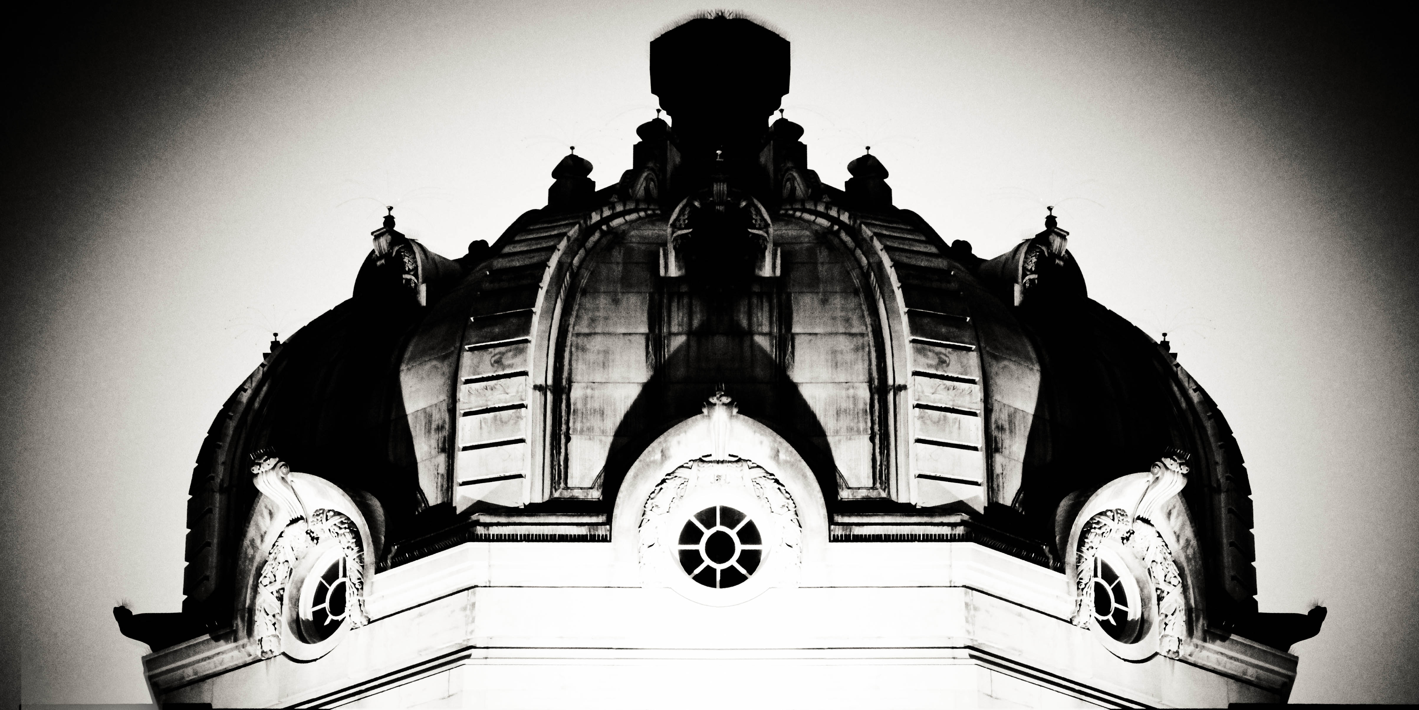 The photograph captures the intricate details of a grand dome, showcasing its regal architecture against a stark monochromatic background. Shadows play dramatically across the surface, enhancing the symmetrical lines and ornamental features, while the muted lighting evokes a sense of mystery and timelessness.