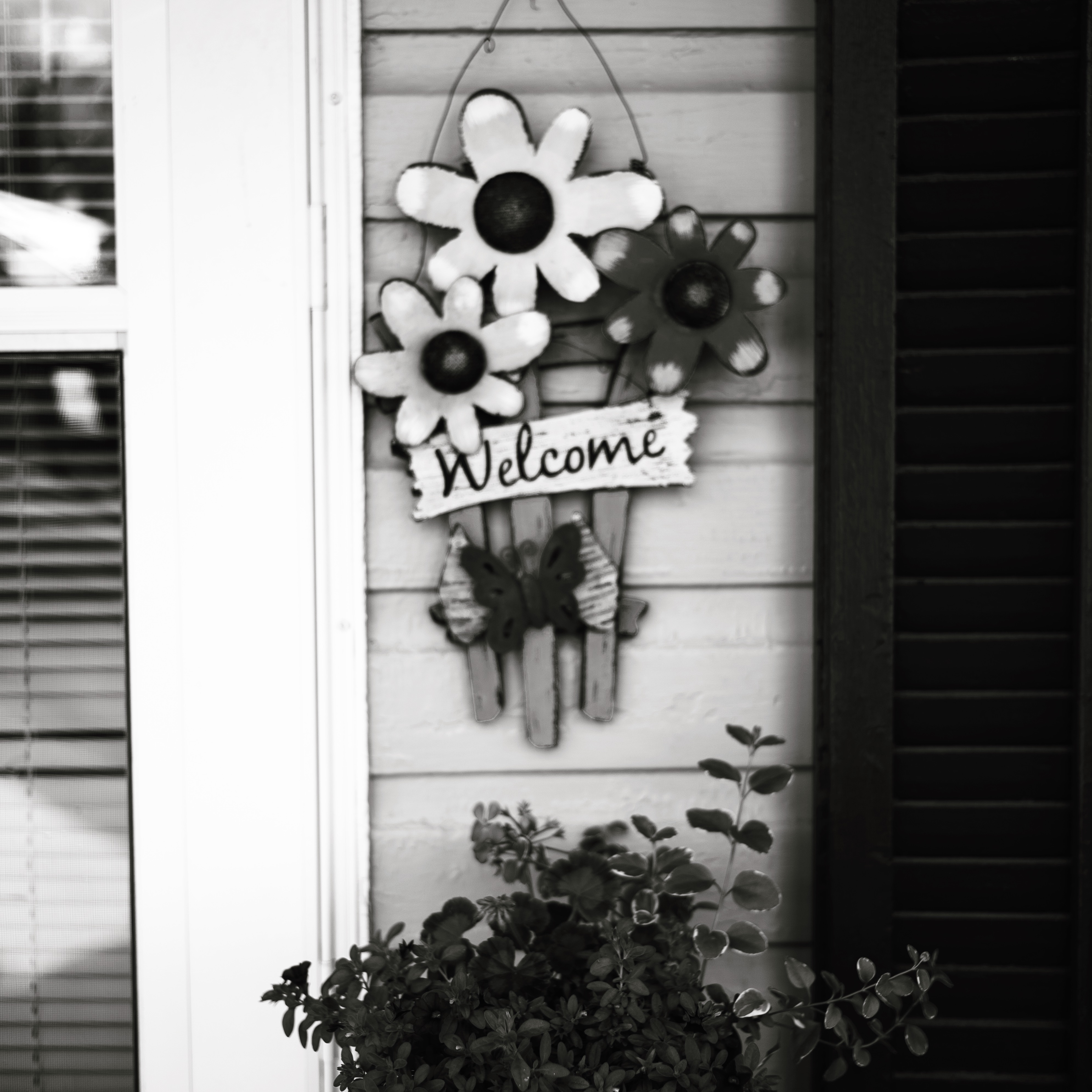 This monochromatic photograph captures a whimsical welcome sign adorned with vibrant flowers, evoking a warm and inviting atmosphere. The soft shadows and light play off the textured surfaces, enhancing the nostalgic charm of the entryway. A small potted plant in the foreground adds a touch of life, grounding the composition in a cozy, homey mood.