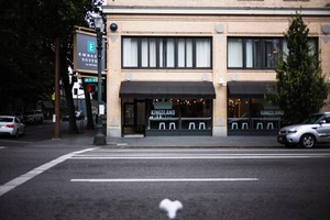 This photograph captures a charming street view of a building featuring a café named 'Kingsland.' The soft, ambient lighting suggests a cozy atmosphere, while the muted tones of the surrounding architecture evoke a sense of calm in the urban landscape, inviting contemplation. The intentional framing from the street perspective adds depth and emphasizes the welcoming nature of the café's exterior.