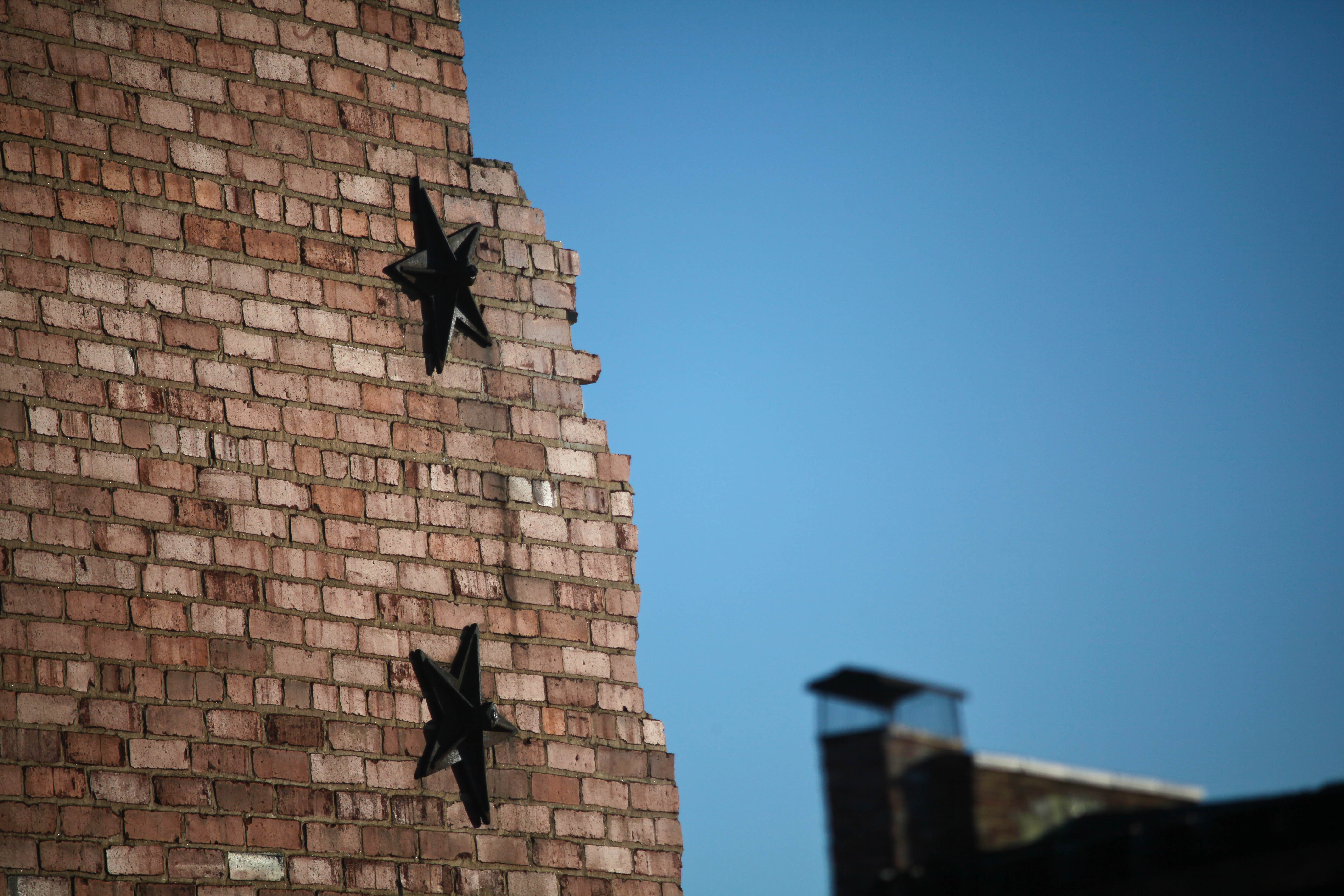 The photograph captures a close-up of a weathered brick wall, highlighted by two prominent black stars embedded within. The stark contrast of the dark stars against the warm, aged bricks evokes a sense of nostalgia, while the clear blue sky in the background adds a touch of tranquility. The composition, focusing on texture and form, invites viewers to reflect on the passage of time and forgotten stories.