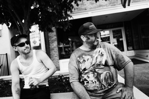 In a gritty black-and-white setting, two men sit casually, engaged in their own thoughts. The mood is laid-back yet introspective, highlighted by the stark contrast of light and shadow that frames their expressions. The composition captures a moment of camaraderie, with a backdrop of urban life subtly hinting at the passage of time.