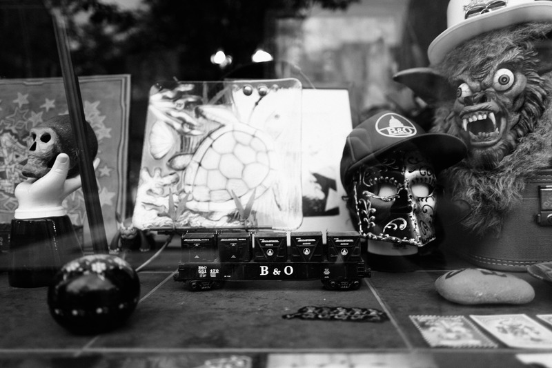 This black and white composition captures a whimsical display of eclectic objects, including a skull figurine, an ornate turtle illustration, and a playful mask, creating a rich tapestry of textures and shapes. The dim lighting adds a mysterious mood, inviting the viewer to ponder the stories behind each item. The eclectic mix suggests a blend of nostalgia and surrealism, drawing the eye across the varied elements within the frame.