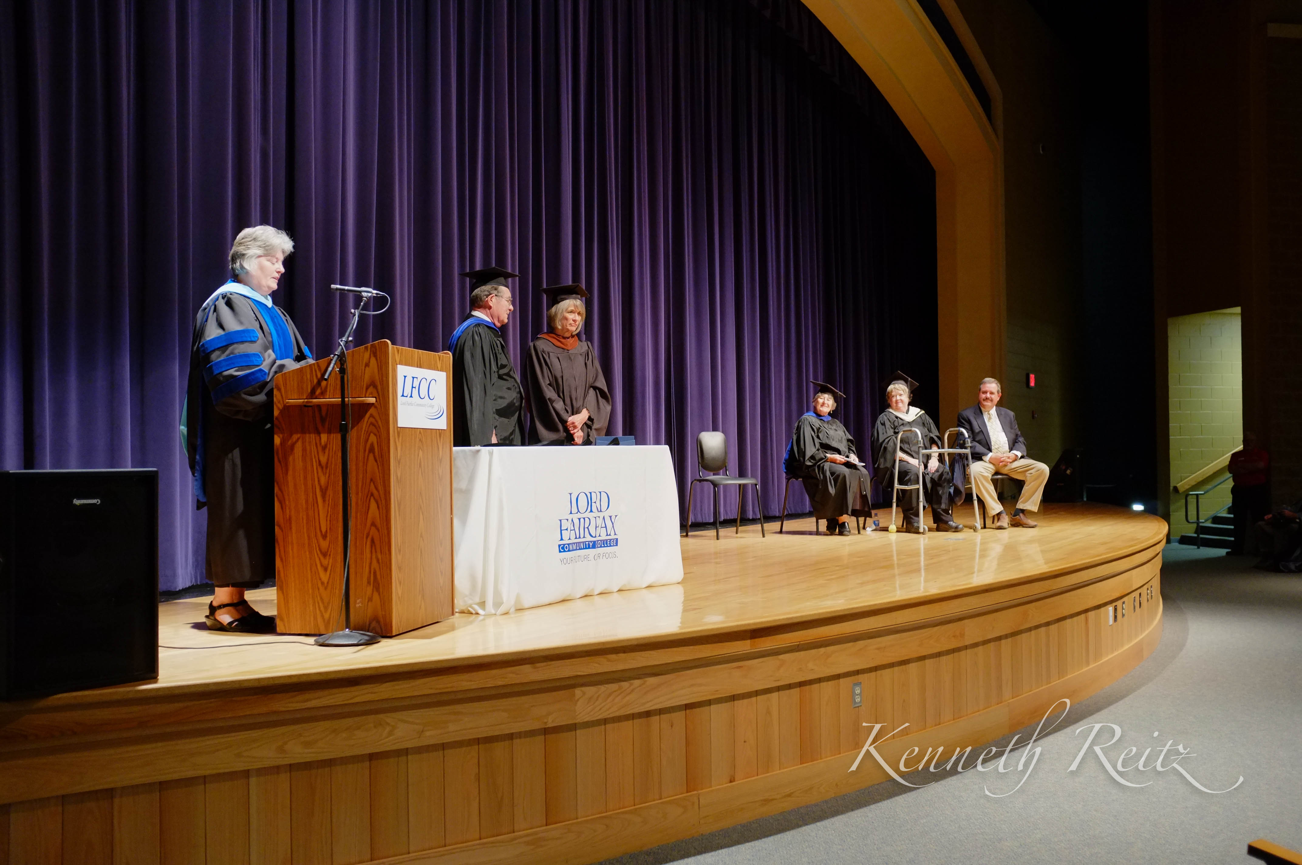 A formal graduation ceremony unfolds on a well-lit stage, highlighting a group of educators in academic regalia. The mood is one of anticipation and celebration, with a deep purple curtain providing a regal backdrop to the proceedings. The composition draws the eye towards the podium where a speaker addresses the audience, while the seated faculty members await their turn, encapsulating the significance of this milestone event.