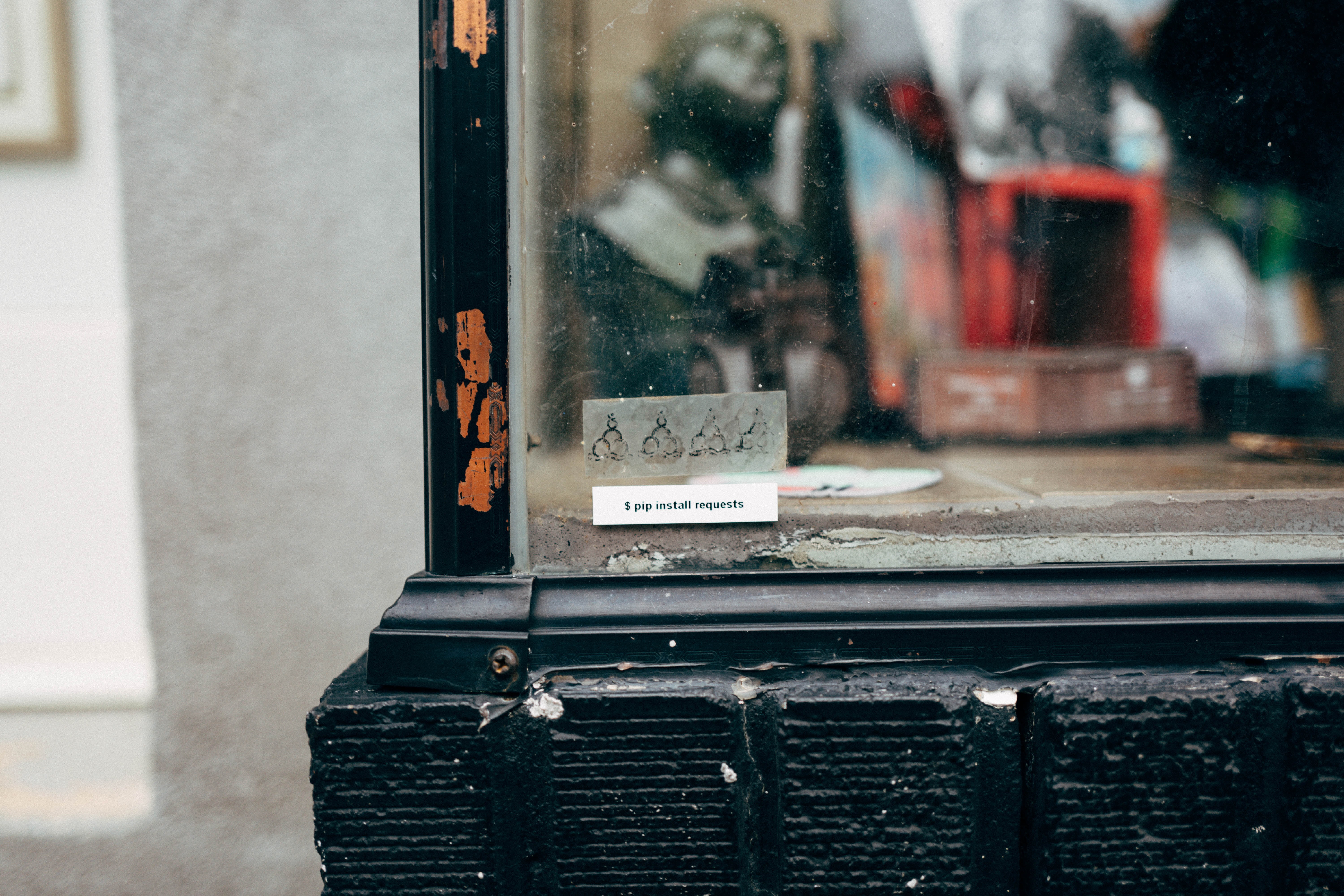 A close-up of a weathered storefront window reveals a sticker with playful text, juxtaposed against the backdrop of a blurred interior filled with eclectic decor. The cracked and peeling paint of the frame hints at age and neglect, while diffused lighting creates a soft, nostalgic mood, inviting curiosity about the world within. The interplay of reflections adds depth, suggesting a story waiting to be uncovered.