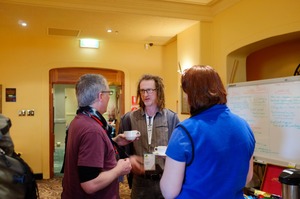 In a warmly lit space, three individuals engage in a lively conversation, cups in hand, exuding a sense of camaraderie and connection. The soft yellow tones of the background create an inviting atmosphere, while the focus on their animated expressions enhances the intimate mood of the gathering. The casual attire and the informal setting suggest an event filled with friendly exchanges and shared ideas.