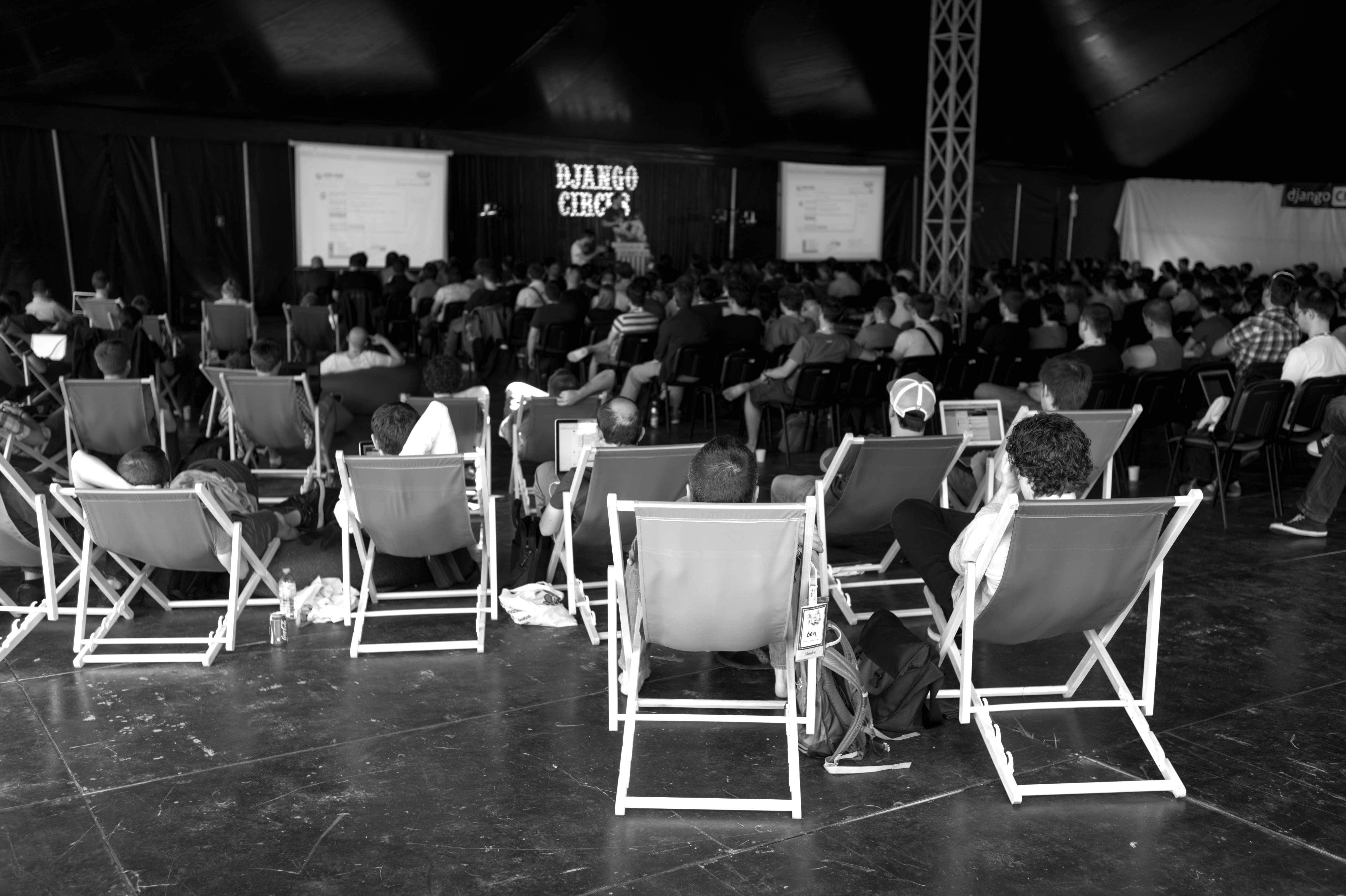 This photograph captures a large audience seated in beach chairs, intently focused on a presentation at a tech conference. The black-and-white composition highlights the casual yet engaged atmosphere, with soft lighting accentuating the relaxed demeanor of the participants. The juxtaposition of informal seating against a professional setting creates a unique blend of comfort and concentration.
