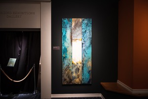 A striking abstract artwork dominates the wall, its vibrant hues of turquoise and gold beckoning viewers closer. The dramatic contrast against the dark wall amplifies the artwork’s luminous center, creating a sense of depth and intrigue. Soft lighting casts gentle shadows, enhancing the mood of contemplation in this serene gallery space.