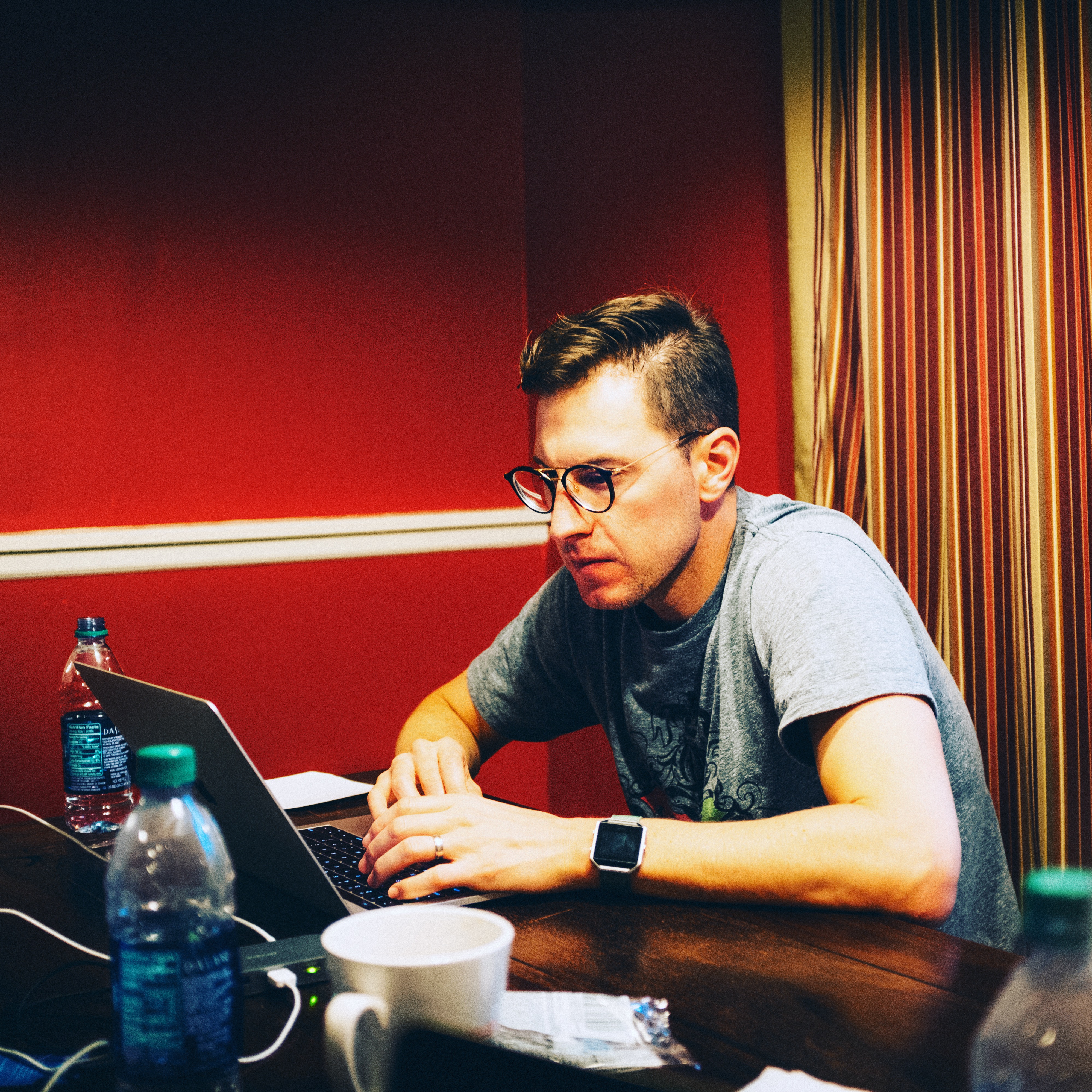 In a cozy, warmly lit room, a man sits intently at a wooden table, engrossed in his laptop. The red walls and soft stripes of the curtains create a vibrant backdrop, enhancing the contemplative mood as he types. The scene, dotted with water bottles and a coffee cup, reflects both productivity and a sense of casual familiarity.