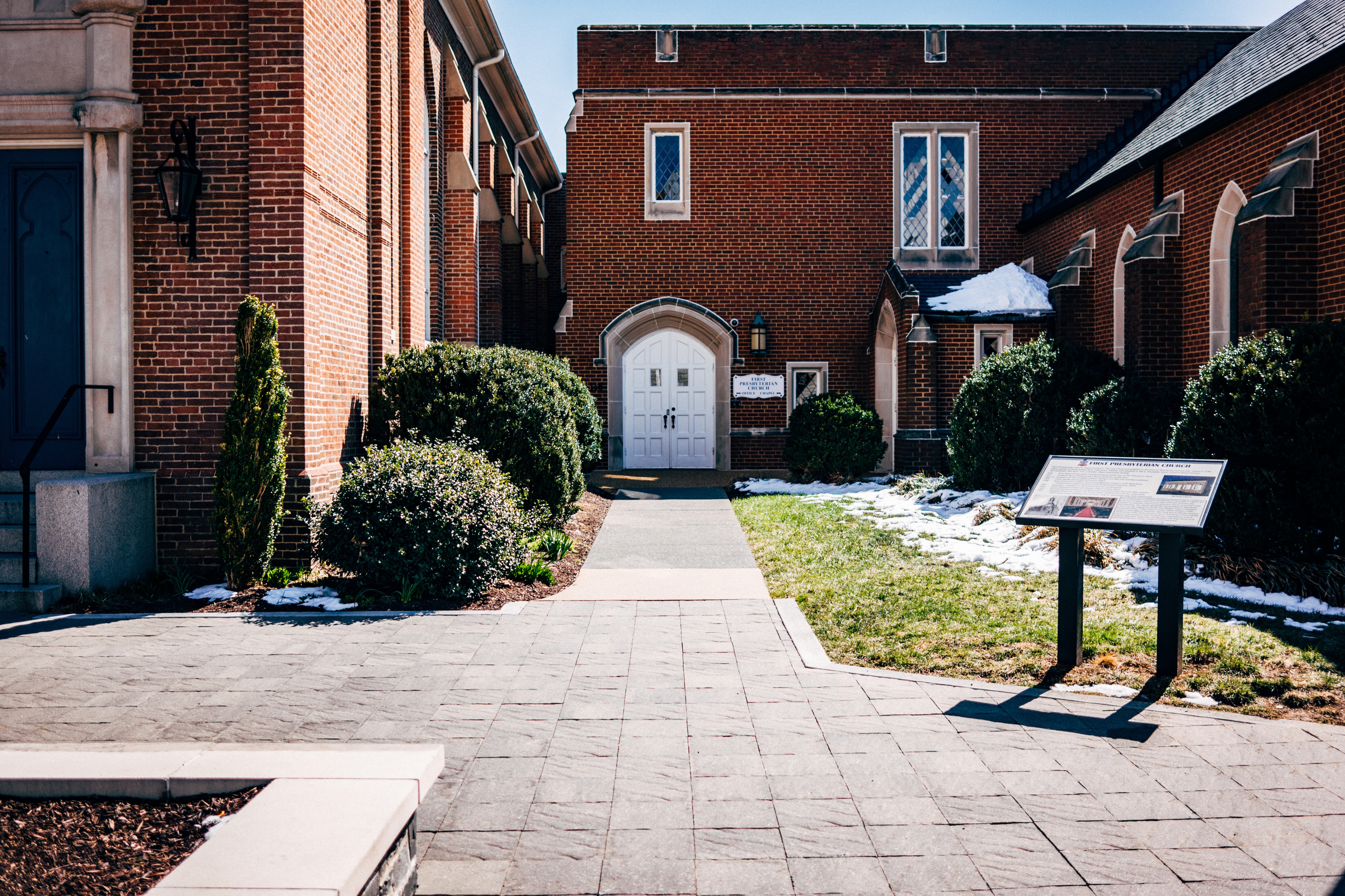 The photograph captures a tranquil pathway leading towards a distinctive white door framed by rich brick walls and lush greenery, evoking a sense of calm and welcome. Soft winter light illuminates the scene, highlighting the contrasting textures of the surroundings as remnants of snow linger on the grass. The composition invites the viewer to explore the serene environment, merging architectural elegance with nature's subtle beauty.