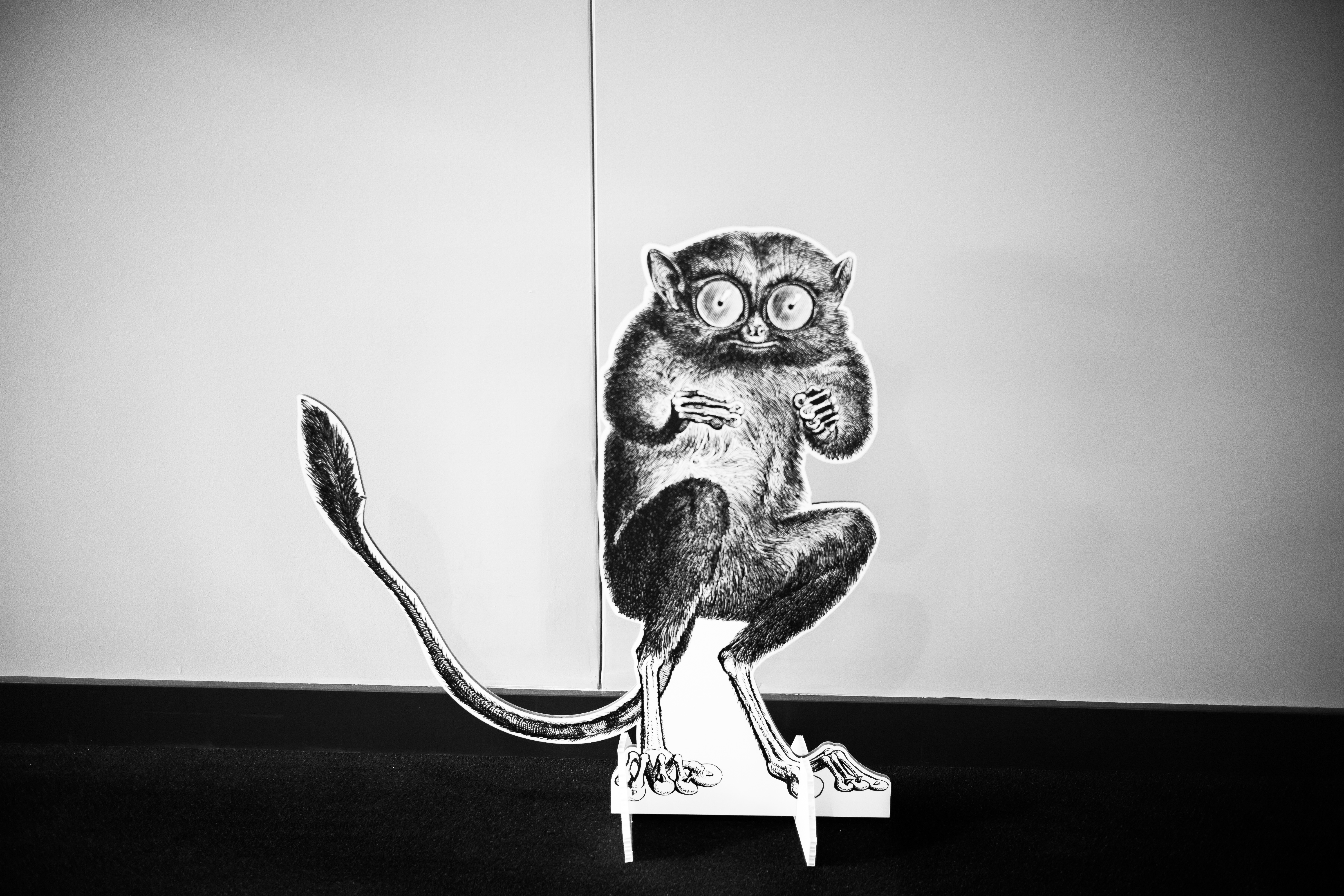 This black and white photograph captures a whimsical cutout of a monkey, striking a curious pose against a stark wall. The contrast between the detailed, textured illustration and the minimalistic background creates an intriguing focal point, evoking a mix of playfulness and surrealism. Soft lighting casts subtle shadows, enhancing the three-dimensional feel of the cutout and adding depth to the composition.