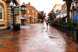 A lone figure walks down a brick-paved street, reflecting puddles capturing the muted ambiance of a rainy day. The warm tones of the brick buildings contrast with the gray sky, evoking a sense of solitude and calm. Streetlights stand sentinel along the pathway, illuminating the scene with a soft glow, while autumn leaves hint at the season's transition.