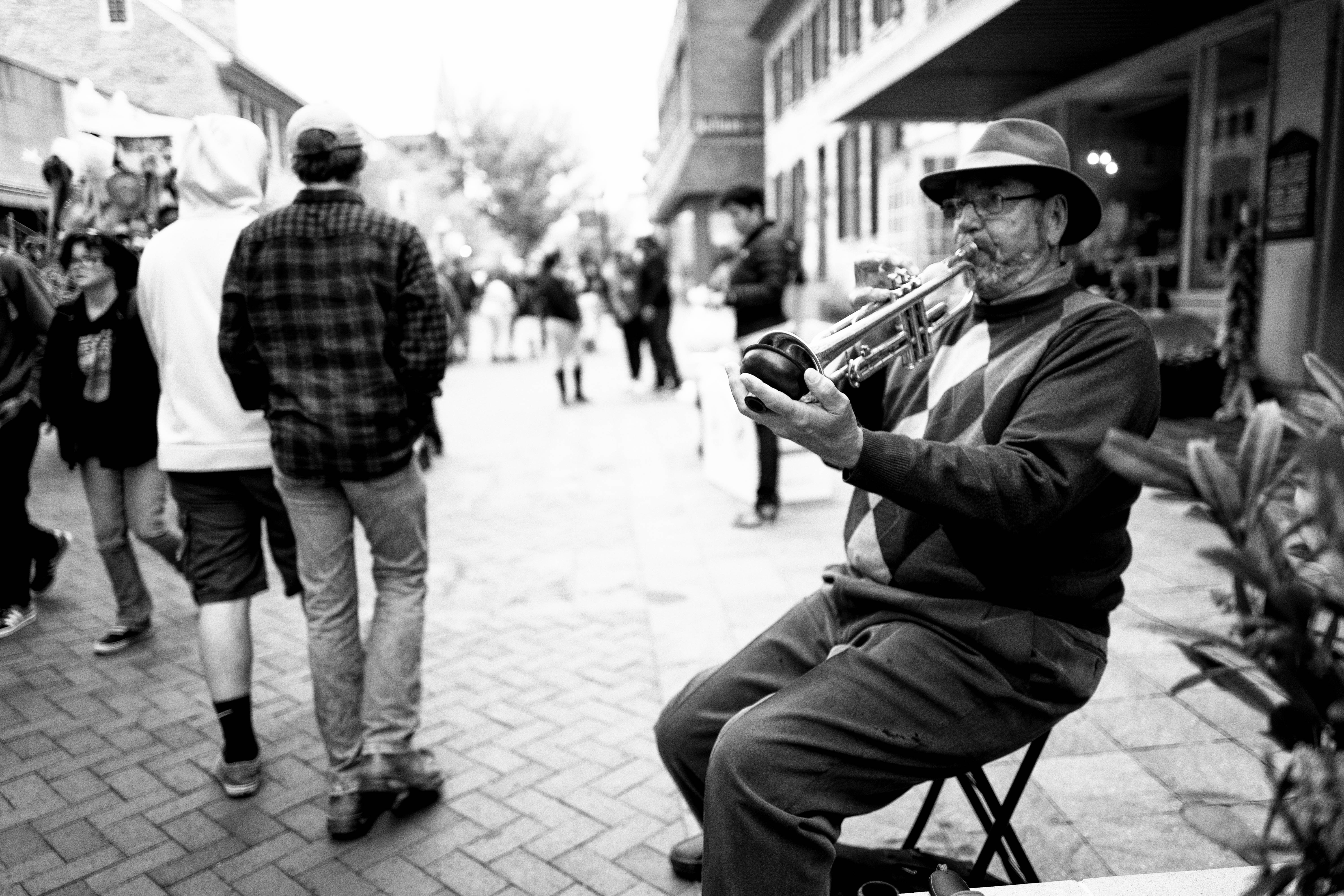 A solitary musician plays the trumpet, seated amidst a bustling street scene. The black-and-white palette enhances the nostalgic mood, showcasing the contrast between the focused artist and the blurred movement of passersby. Soft, diffused light envelops the scene, creating an intimate atmosphere that invites viewers to pause and appreciate the music in a lively environment.