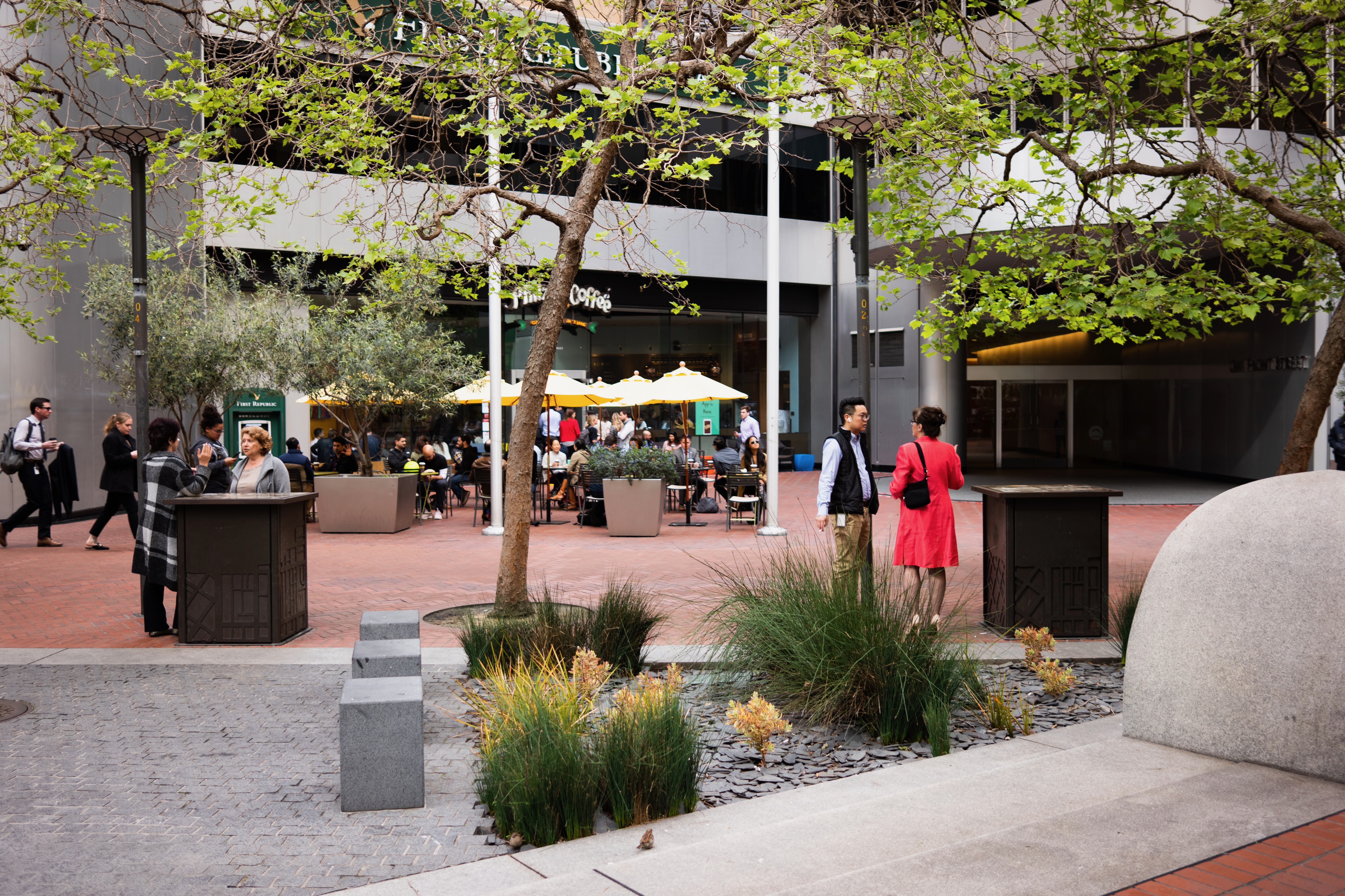 This photograph captures a vibrant urban plaza where people mingle against a backdrop of modern architecture and blossoming greenery. Two figures in conversation stand amidst the foliage, while a lively café scene buzzes with patrons sitting outside under sun umbrellas. The composition blends natural elements with city life, evoking a mood of connection and community in a busy setting.