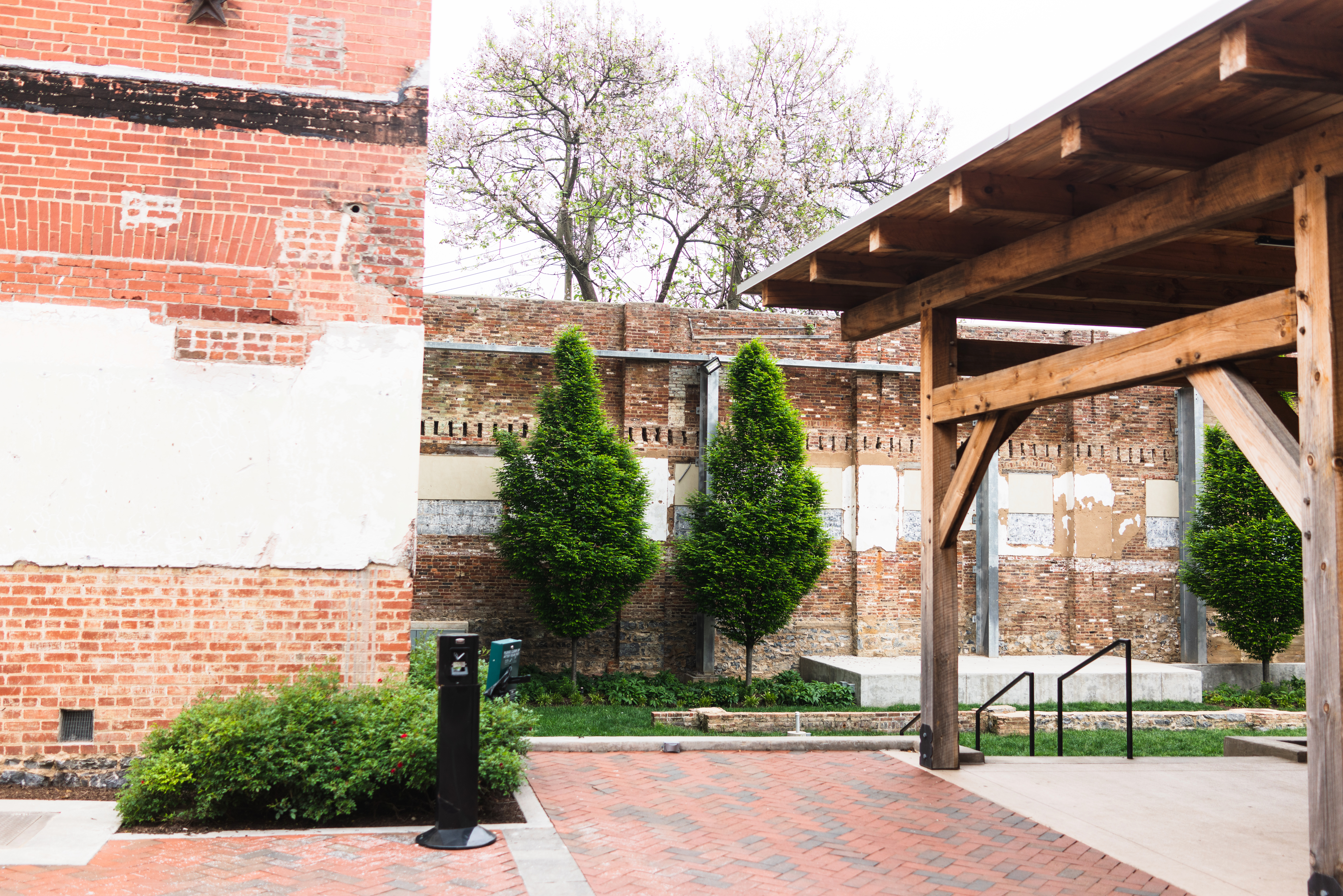 This photograph captures a quiet urban space, where a blend of old brick walls meets modern wooden structures. Lush greenery contrasts beautifully against the weathered surfaces, while soft, diffused lighting creates a calm, welcoming atmosphere. The composition invites contemplation, echoing a sense of history entwined with nature's persistence.